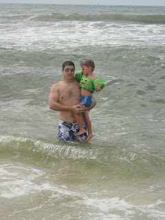 Ethan finally ventured into the water with Lonnie. He borrowed Allison's floatie and had a blast! The waves didn't seem to scare him when he was with Lonnie (you know, in his big, strong arms). ;)